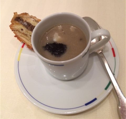 店家贈送了一道soupe,朝鮮薊的湯, 又是加黑松露。 感覺這法餐里黑松露就等同于中國的醬油,百搭啊!