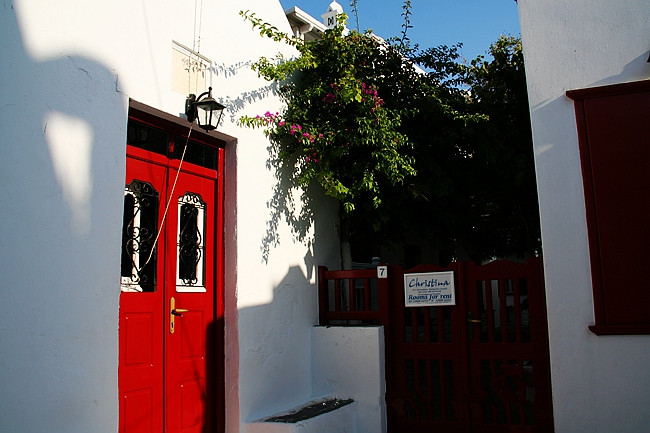 美麗的白色石頭小路,迷宮一般復雜的小徑,雪白動人的盒形屋宇和門窗上鮮艷的藍、綠、紅等燦爛繽紛的色調,在藍天大海的襯托下,構成了米諾克斯別樣的風情。