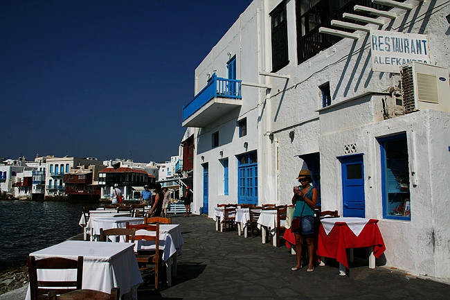 小鎮的盡頭,有一處被稱為“小威尼斯”的地方,是島上最美麗的角落。一幢幢白色的小屋和樓臺就建在波濤洶涌的海邊,這里餐廳、酒吧林立,極富有威尼斯情調,是觀賞米島日落的最佳地點,也是游客最多的地方。