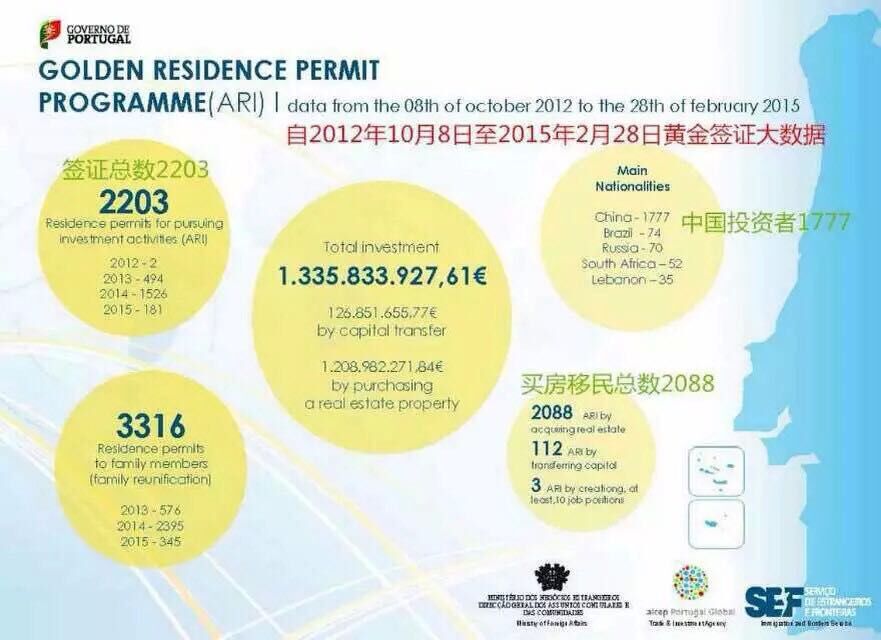 葡萄牙移民局發(fā)布了截止到2015年2月28日最新的官方數(shù)據(jù),自2012年10月8日開始實(shí)施“黃金居留許可計(jì)劃”以來,累計(jì)成功獲得葡萄牙黃金簽證的人數(shù)已達(dá)到2203個(gè),投資總金額已超過13.3億歐元。其中,通過購置房產(chǎn)獲得身份的人數(shù)為2088個(gè)(約占總?cè)藬?shù)的95%),投資金額約為12億歐元。主要購房人群來自中國,共計(jì)1777個(gè)。通過申請(qǐng)家庭團(tuán)聚獲得居留卡的人數(shù)為3316個(gè)。