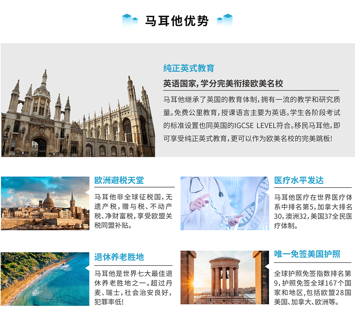 如果您有海外投資、開辦企業(yè)避稅、分散國內(nèi)投資風(fēng)險(xiǎn)、海外貿(mào)易等需求,或是希望在馬耳他工作、享受馬耳他超優(yōu)質(zhì)的教育和醫(yī)療服務(wù),抑或是渴望擁有 一張歐洲自由通行證,那么馬耳他投資居留計(jì)劃都是您的絕佳選擇! |