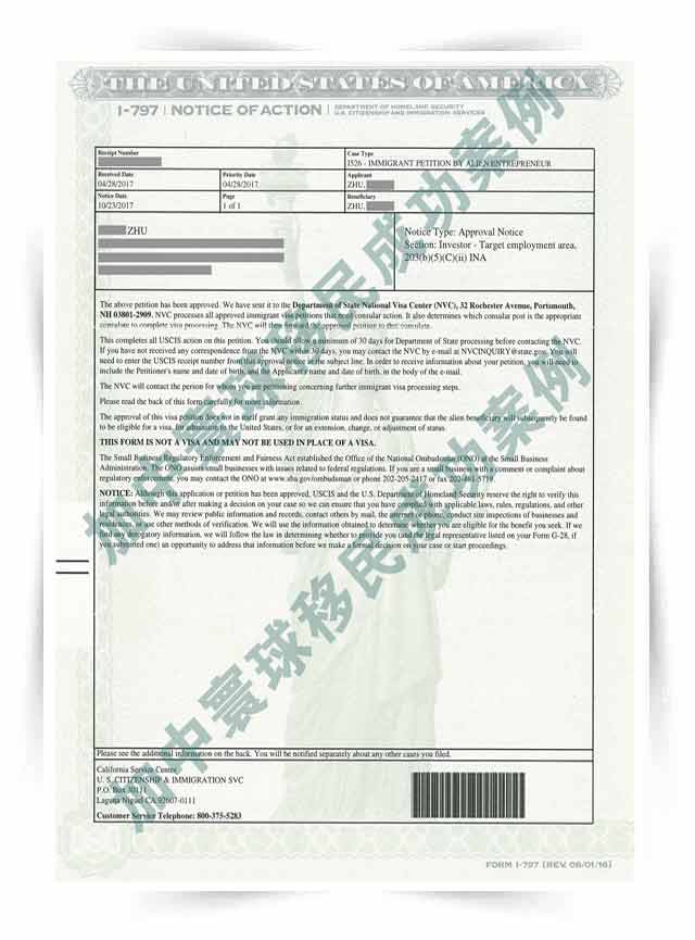 好消息!加中寰球EB-5客戶朱先生投資的“圣地亞哥酒店項目”I-526今日獲批,從遞交申請到獲批,僅用了6個多月時間!