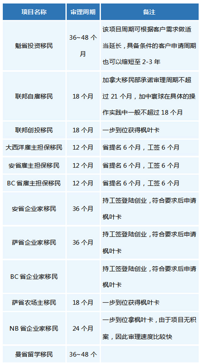 根據(jù)加拿大移民部官網(wǎng)及使領(lǐng)館公布的簽證進(jìn)度以及加中寰球辦理加拿大移民項目的操作實踐,總結(jié)了加拿大12個熱門移民項目的大概審理周期,僅供參考。由于每個客戶的背景不同,申請材料的復(fù)雜程度不同,以及加拿大移民政策的變更,加拿大個移民項目的審理周期可能會有出入,以實際情況為準(zhǔn)。