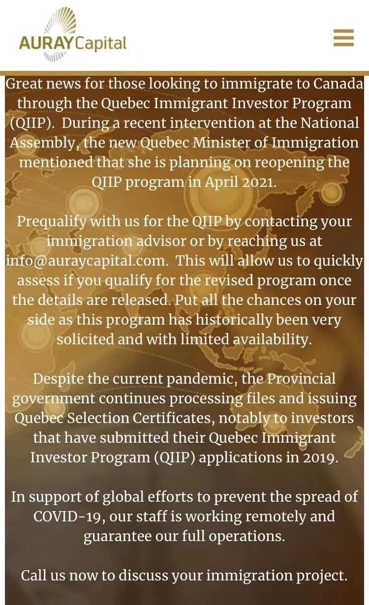 加拿大時間2020年9月22日,魁北克投資移民項目的相關方、也是加中寰球的最密切合作伙伴AURAY Capital基金公司在其網站首頁公布了一個好消息:魁省新任移民部長計劃在2021年4月重啟魁北克投資移民項目!