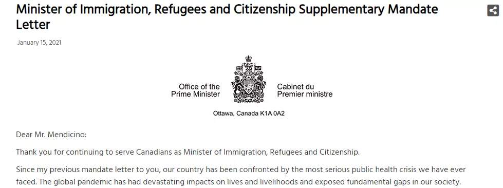加拿大總理特魯多近日向移民部長馬可·門迪奇諾(Marco Mendicino)簽發了新補充的移民任務授權書(New Supplementary Mandate Letter)。