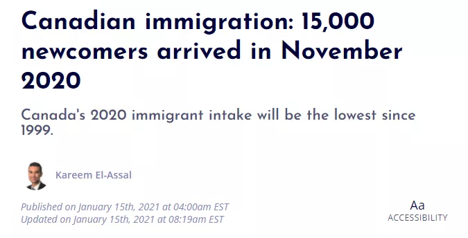 根據聯邦移民部的最新數字,2020年11月有逾1.5萬名新移民抵達加拿大,是連續第三個月保持類似水平。2020年全年的新移民人數預計不足20萬,是1999年以來的最低數字。