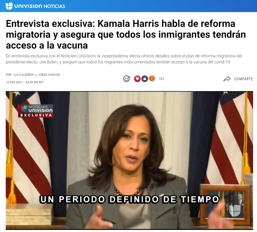 賀錦麗(Kamala Harris)在接受Univision News采訪時(shí)表示,拜登已經(jīng)準(zhǔn)備好了移民改革計(jì)劃,上任后將立即提交國(guó)會(huì),目前國(guó)會(huì)參眾兩院都是民主黨占多數(shù),因此他們計(jì)劃在拜登上任后100天通過(guò)此方案