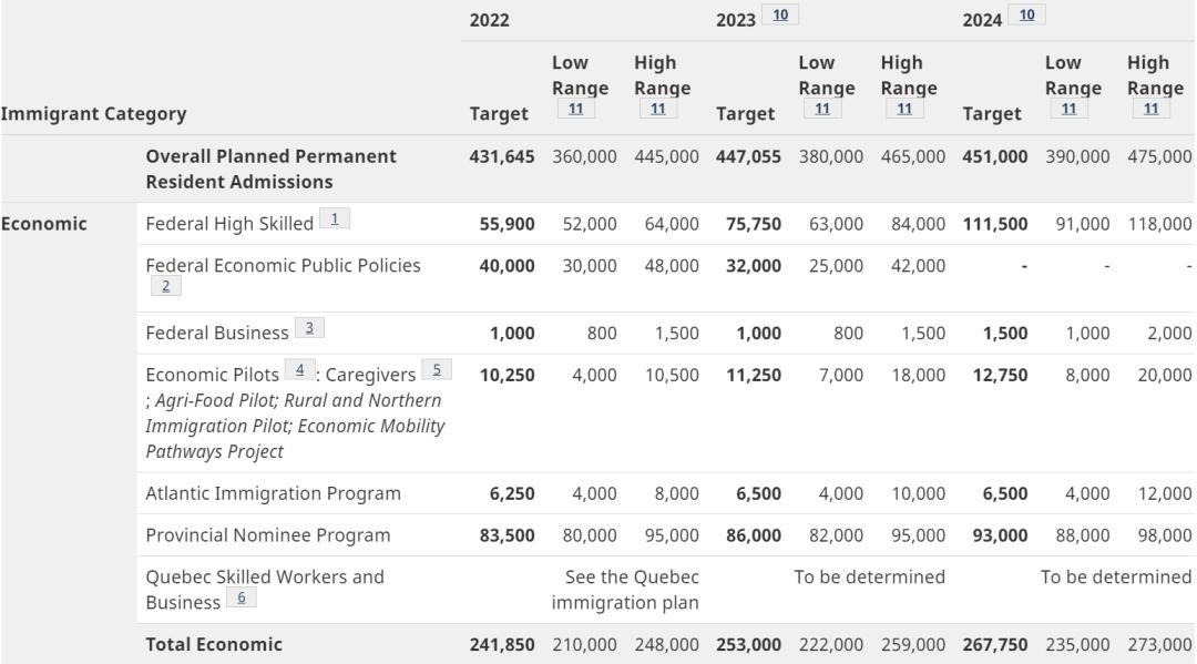 根據最新的加拿大2022-2024年移民水平計劃,未來三年,加拿大將接收超過130萬新移民,具體如下: