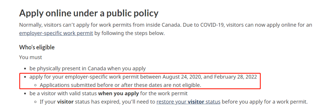 1. 允許已經在加拿大境內,且有有效身份的臨時訪客(包括已提交延期/或有資格身份恢復)申請雇主限定的工作許可;