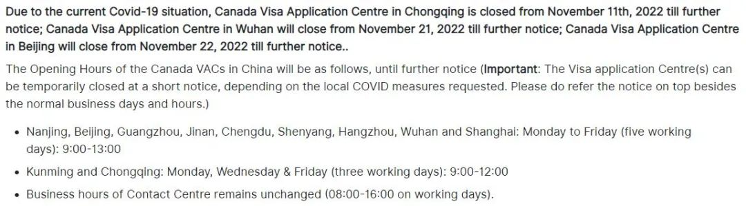 受疫情影響,加拿大簽證中心VFS Global近期在其官方網(wǎng)站上公布了一則重要通知,位于北京的加拿大簽證中心于2022年11月22日起關(guān)閉,而位于武漢的加拿大簽證中心已于2022年11月21日起關(guān)閉,位于重慶的加拿大簽證中心已于2022年11月11日起關(guān)閉,恢復(fù)時間另行通知。