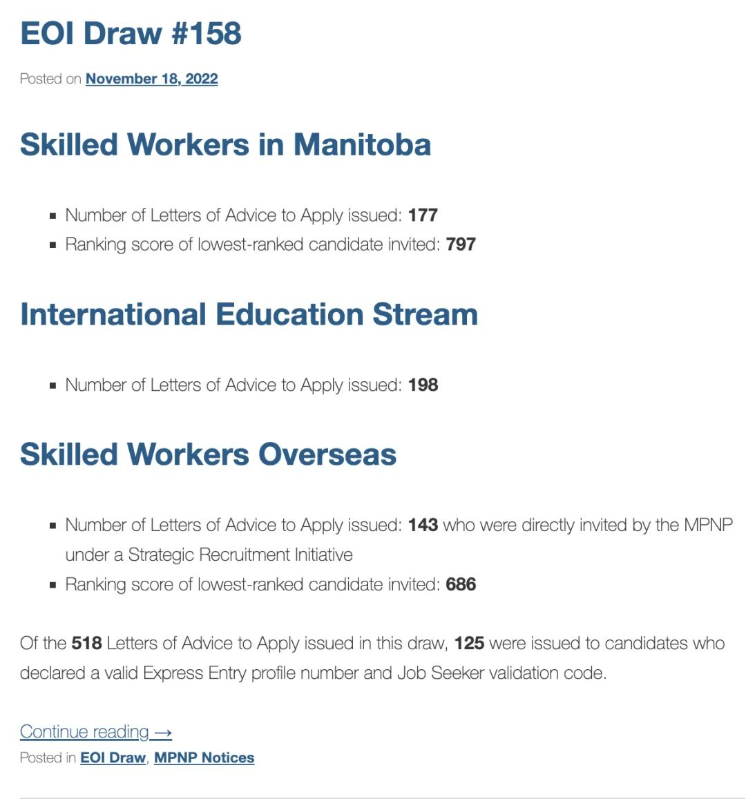 不僅如此,按照以往邀請情況來看,像曼省國際學(xué)生類別每輪只有40-50人符合要求,但由于此次暫停時間較久,所以邀請人數(shù)有所增加,導(dǎo)致分配給曼省技術(shù)工人類別申請人的名額變少,進(jìn)一步影響分?jǐn)?shù)情況。