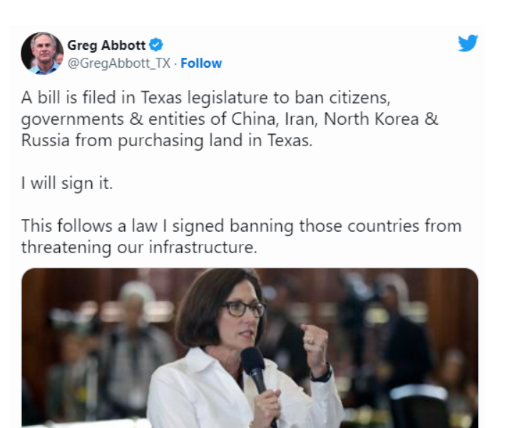 如果該提案最終通過眾議院批準及州長簽字成為立法,未來這四國公民,即使沒有美國長期居留身份亦能夠在德州購買房屋,但最多只能購買 20 英畝的土地。