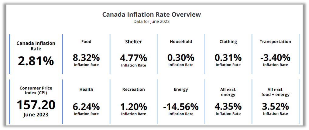 在經歷了最近幾年的物價飛漲之后,加拿大的通貨膨脹率已回到目標范圍。加拿大統計局的報告稱, 繼今年5月份的通脹率為3.4%之后,6 月份通脹率降至2.8%,遠低于去年夏天8.1%的的峰值