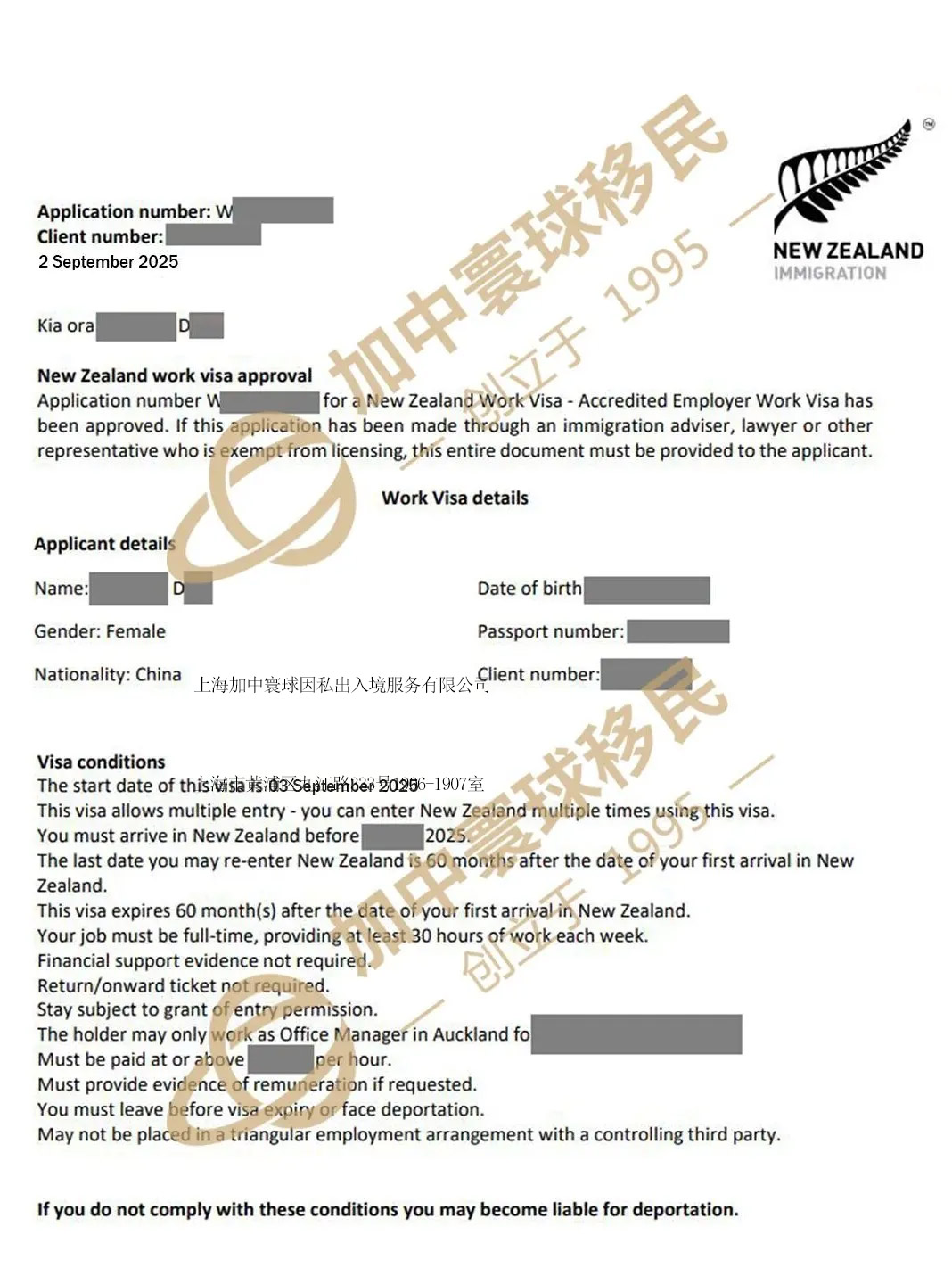 恭喜D 女士成功獲批新西蘭六分制工簽案例