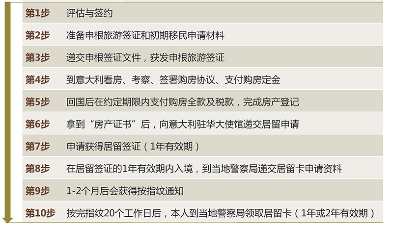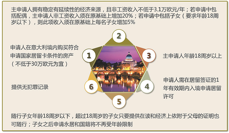 意大利外交部協同內政部等8個部委共同頒布“入境簽證類型和獲取條件”的 850號法令。根據政策,申請人在意大利購買用于居住的房產,并能提供長期的、穩定的非工資性生活來源(不低于3.1萬歐元/年),意大利駐華大使館可發放“選擇性居留簽證”。在申請人到達意大利 8 天之內,須申請將簽證轉為1年期居留卡,獲得首期1年期居留卡即可享受與意大利公民同等的社會福利(政治權利除外)。以后大約每2年更新一次居留卡。持居留卡5年后,可申請意大利永居卡(拿到永居卡以后可在意大利工作)。持永居卡5年后可申請入籍。但由于該法令缺乏清晰的實施細則,操作起來有一定難度,故未得到大力推廣。