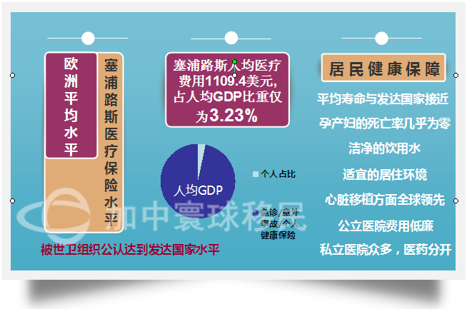 出,其醫(yī)療保險水平高于歐洲的平均水平,被世界衛(wèi)生組織公認(rèn)為達(dá)到發(fā)達(dá)國家的水平,尤其是在心臟移植方面全球領(lǐng)先。政府報告顯示,塞浦路斯每480個人就擁有1名全科醫(yī)生,每1,100個人中就有1名牙醫(yī),每215人中就有1名護士。塞浦路斯人均醫(yī)療費用約1109.4美元,醫(yī)療費用占人均GDP比重僅為3.23%。