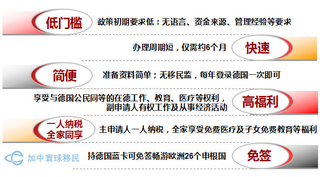 客戶只需要有不太高的資金實力,在6個月左右的時間即可實現全家一起登陸德國,并且享受德國超高的社會福利。