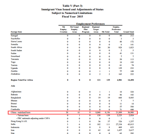 最近DOS(美國國務(wù)院)簽證辦公室發(fā)布了2015財年的EB-5簽證的統(tǒng)計報告(2014年10月1日至2015年9月30日止,其中包括使領(lǐng)館發(fā)放的數(shù)量以及美國本土轉(zhuǎn)換身份者的數(shù)量總計)。