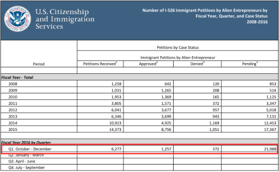 近日,美國移民局USCIS在其官網上更新了2016財年第一季度的EB-5審批數據: