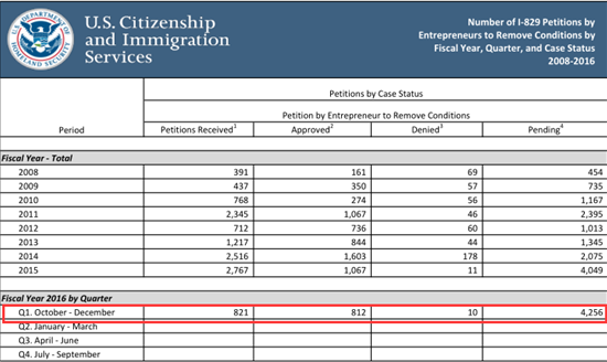 2016財年第一季度I-526和I-829審理的最新數據