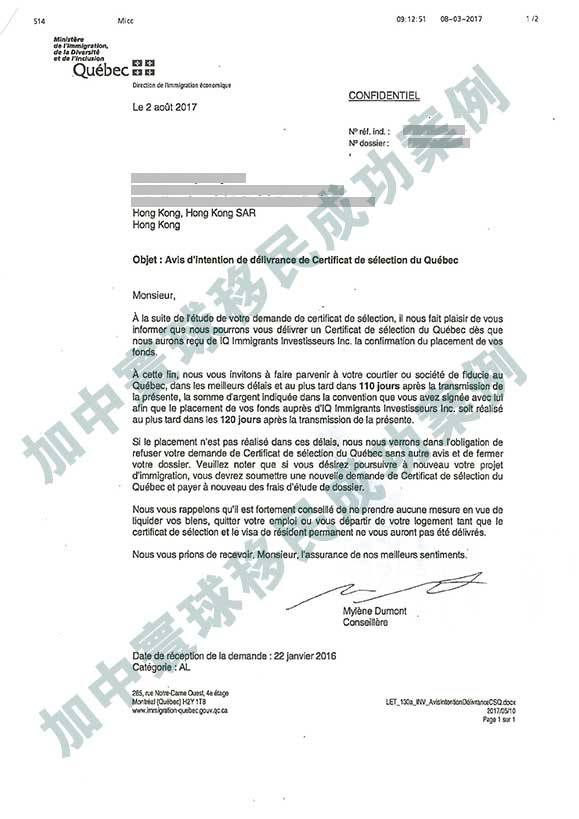 2017年8月3日,加拿大移民魁省項目,白先生獲免面試通過信