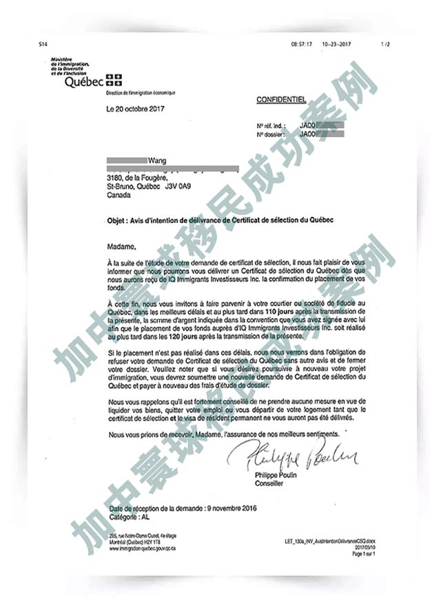 2017年10月23日,加拿大移民魁省項目,王女士免面試通過打款信