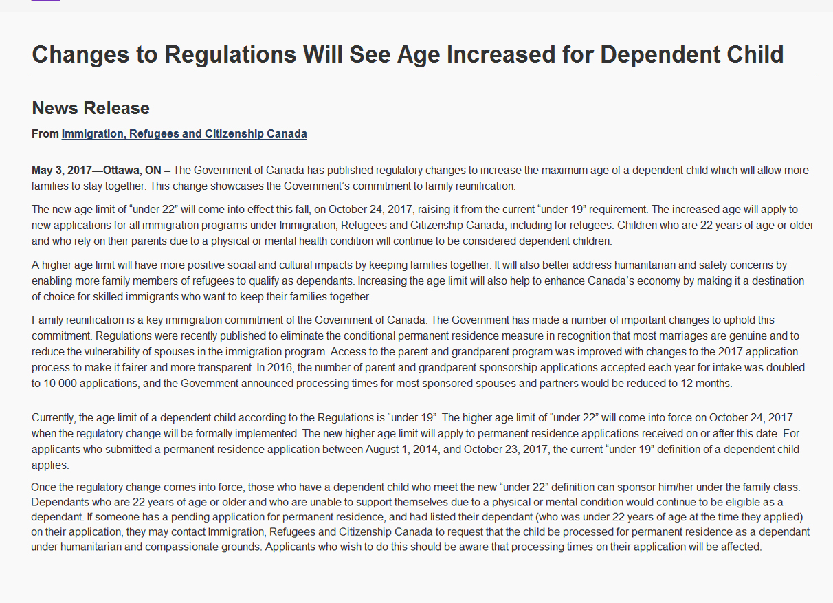 1、若移民申請已經獲批,在新的修正案生效(2017.10.24),小孩還未超過22周歲,可以通過家庭團聚擔保小孩過去;