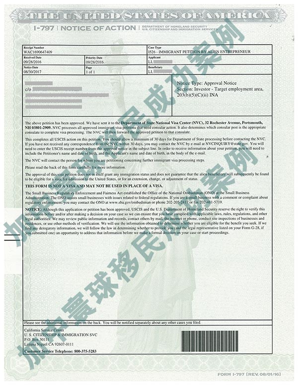 李女士自己經營一家小公司,夫妻二人經過多年積累購置了廠房,李女士將自己名下的廠房出租,每年獲取一些房租。 經過加中寰球資深文案幫助客戶量身定做了資金來源方案,最終決定用每年的房租收益和夫妻二人的工作收入積累來解釋50萬美金的合法來源,最終成功幫助李女士順利拿到I-526批準函,沒有經歷補件,一次性通過! 以下為掃描件(部分個人信息已做遮擋處理)