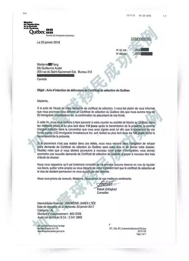 劉先生 收到省提名證書(魁投移民項(xiàng)目) 2016年12月19日,遞交申請(qǐng)材料; 2017年2月4日,建檔; 2017年11月6日,魁投免面試通過; 2018年1月24日,收到CSQ證書。
