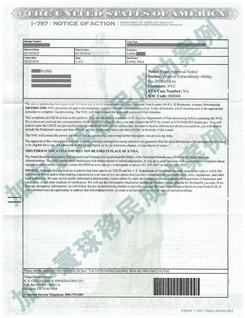 2017年年2月21日,與加中寰球簽約; 2018年1月18日,遞交全套申請材料; 2018年2月1日,建檔; 2018年2月24日,收到美國移民局I-797通過信。 以下是掃描件(個人信息已作遮擋處理)