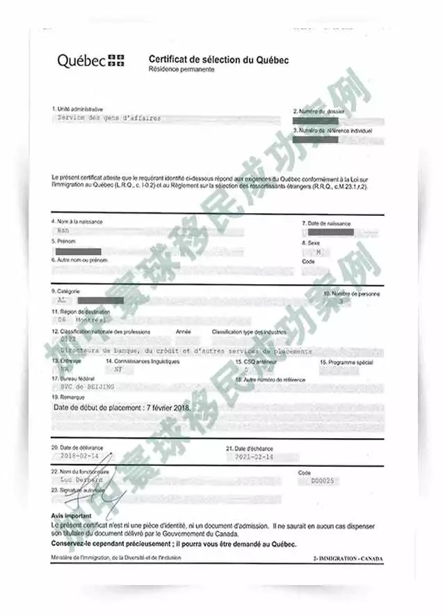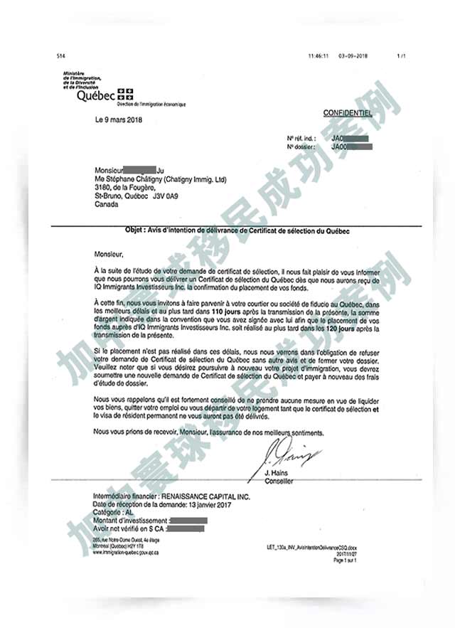 H先生  收到CSQ(魁北克投資移民項目)