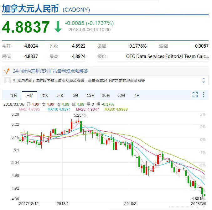 進(jìn)入2018年以來,,從1月8日加元兌人民幣達(dá)到5.2514之后,加元便一路走低,到3月6日的4.8837,已經(jīng)下跌3677點(diǎn),跌幅達(dá)到7%! 與2017年7月26日的5.4358相比,加元跌幅達(dá)到10.2%!這兩個(gè)月以來,人民幣兌加元走出了一波沖天大牛行情!