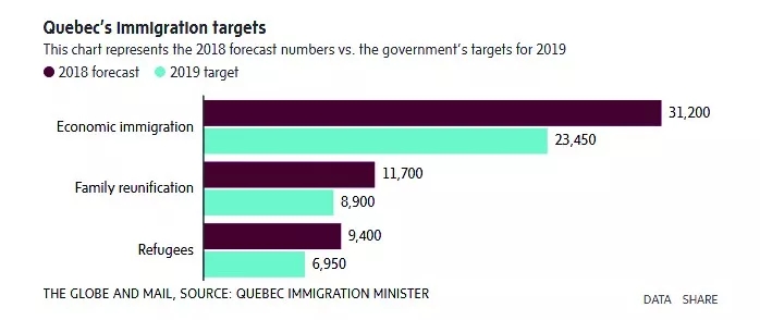 根據這個計劃,魁省2019年將接受約4萬新移民,比2018年減少了1萬3千多人。具體來說,經濟類移民(包括技術移民和企業家移民)從31200名減至23450名,家庭團聚移民從11700名減至8900名,難民從9400名減至6950名。