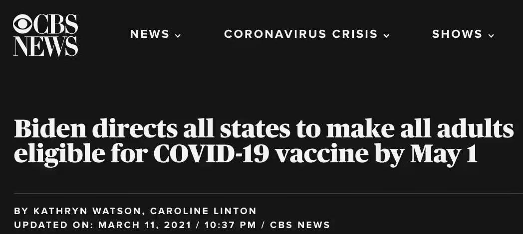 拜登在講話中說:“我將指示所有州、部落和地區(qū),讓所有18歲及以上的成年人在5月1日前,都有資格接種疫苗。”也就是從5月1日起,拜登將指示各州取消疫苗接種資格限制。