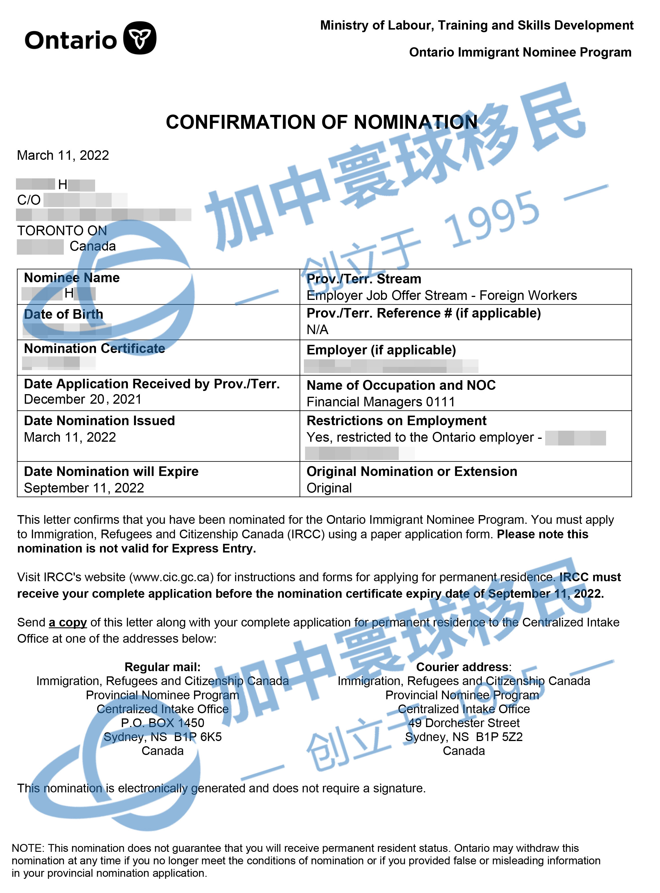 2022-3-11, 收到省提名證書和工簽支持信