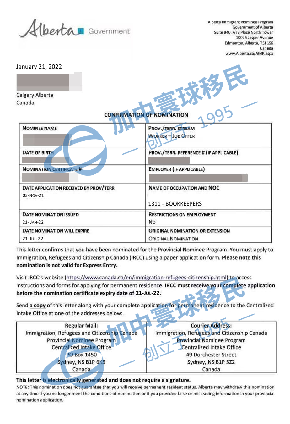 W女士工作經驗豐富,個稅社保記錄文件完整,英語能力達標。簽約之后,我司很快為W女士匹配到與其工作經驗相符的記賬員職位。隨后我們文案團隊開始為W女士準備詳細全面的文件遞交LMIA申請,兩個月LMIA獲批,獲批后在2021年5月遞交工簽申請,僅用一個月時間就拿到工簽。W女士持工簽入境工作三個月時,我們文案團隊幫W女士遞交阿省省提名申請。2022年1月,W女士收到省提名獲批信。