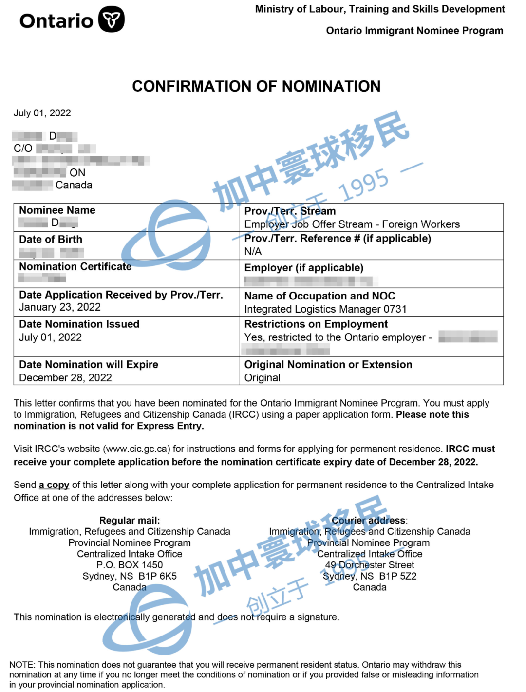 ?2022-07-01 收到安省移民局下發的省提名信、工簽支持信和省提名獲批函。