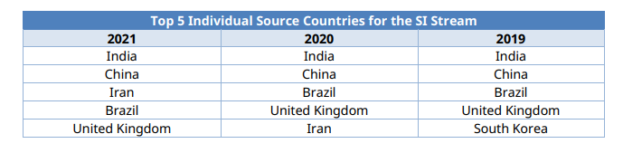 排在前五名的新移民來源國家分別是:印度、中國、伊朗、巴西和英國。