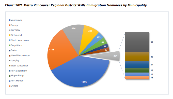最多的大溫地區新移民選擇定居在溫哥華市,其次是素里市。