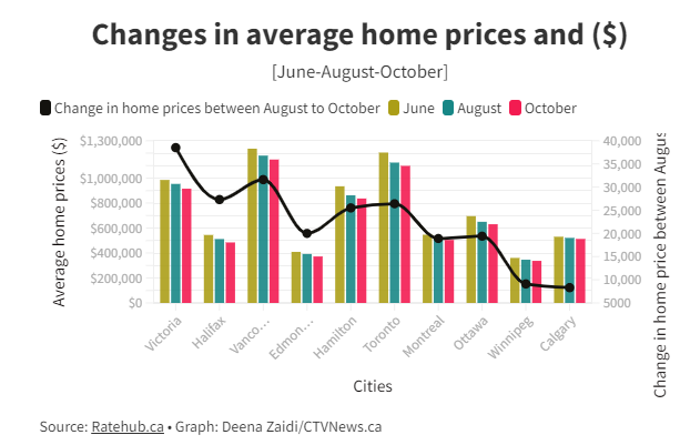該經紀公司使用2022年10月的房地產數據分析了加拿大10個城市,并比較了6月和8月的數據。