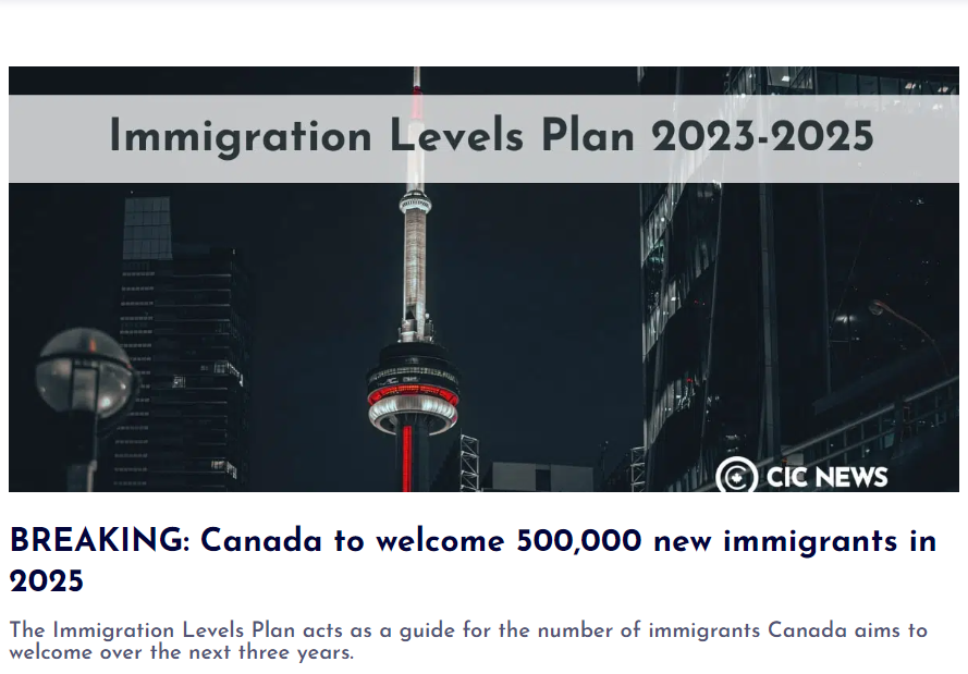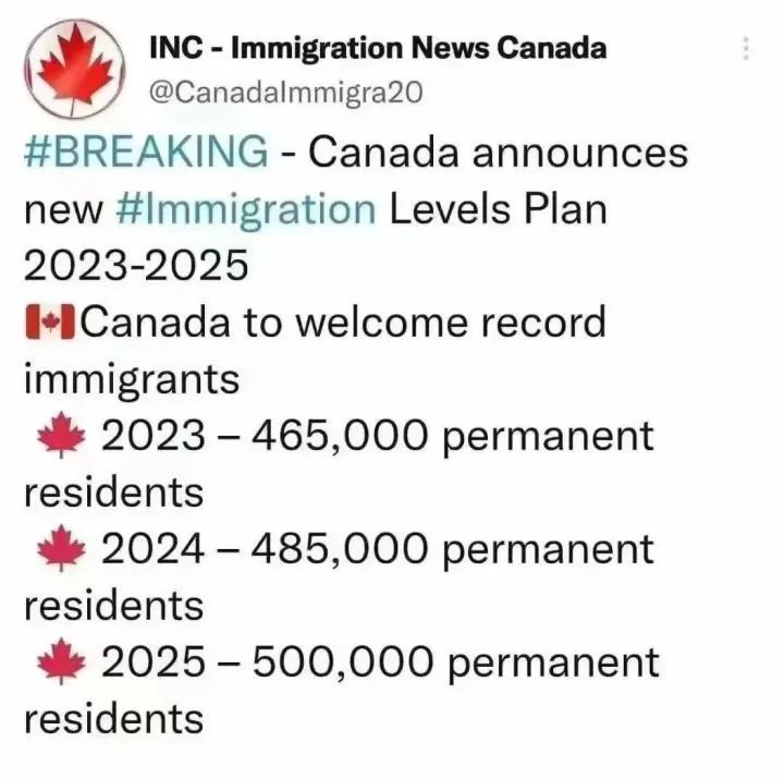 2022年11月1日,加拿大發布了《2023-2025年移民計劃》,計劃3年吸收145萬新移民。