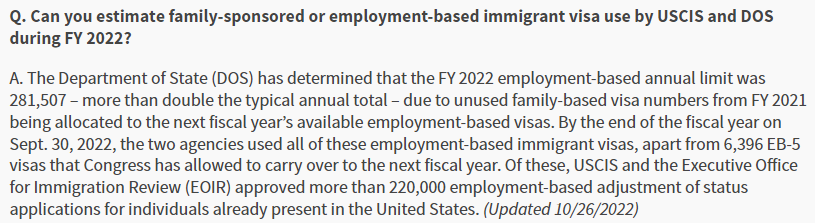 其中移民局和移民審查執(zhí)行辦公室EOIR共批準(zhǔn)了220,000多份針對(duì)人已經(jīng)在美國(guó)的、提交了I-485身份轉(zhuǎn)換的職業(yè)移民綠卡申請(qǐng)。2022年簽發(fā)的職業(yè)移民綠卡數(shù)量是疫情前的2倍。