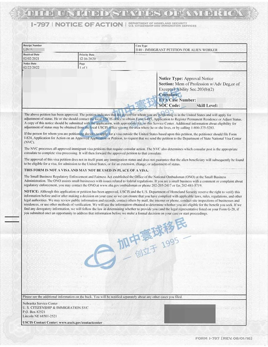 加中寰球客戶Z先生(運營總監)申請美國EB-2雇主擔保移民,于2022年2月23日I-140順利獲批! 有關詳情如下: