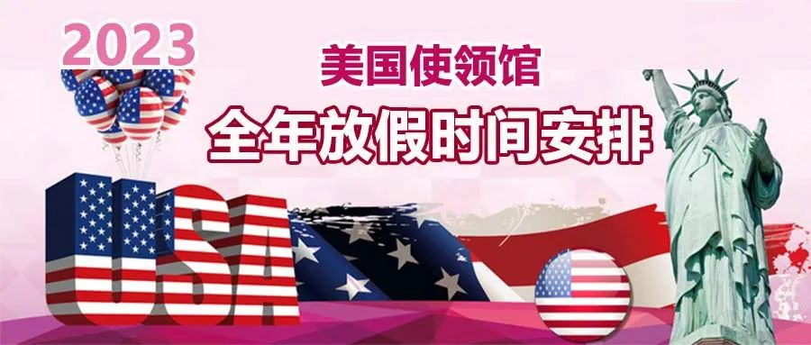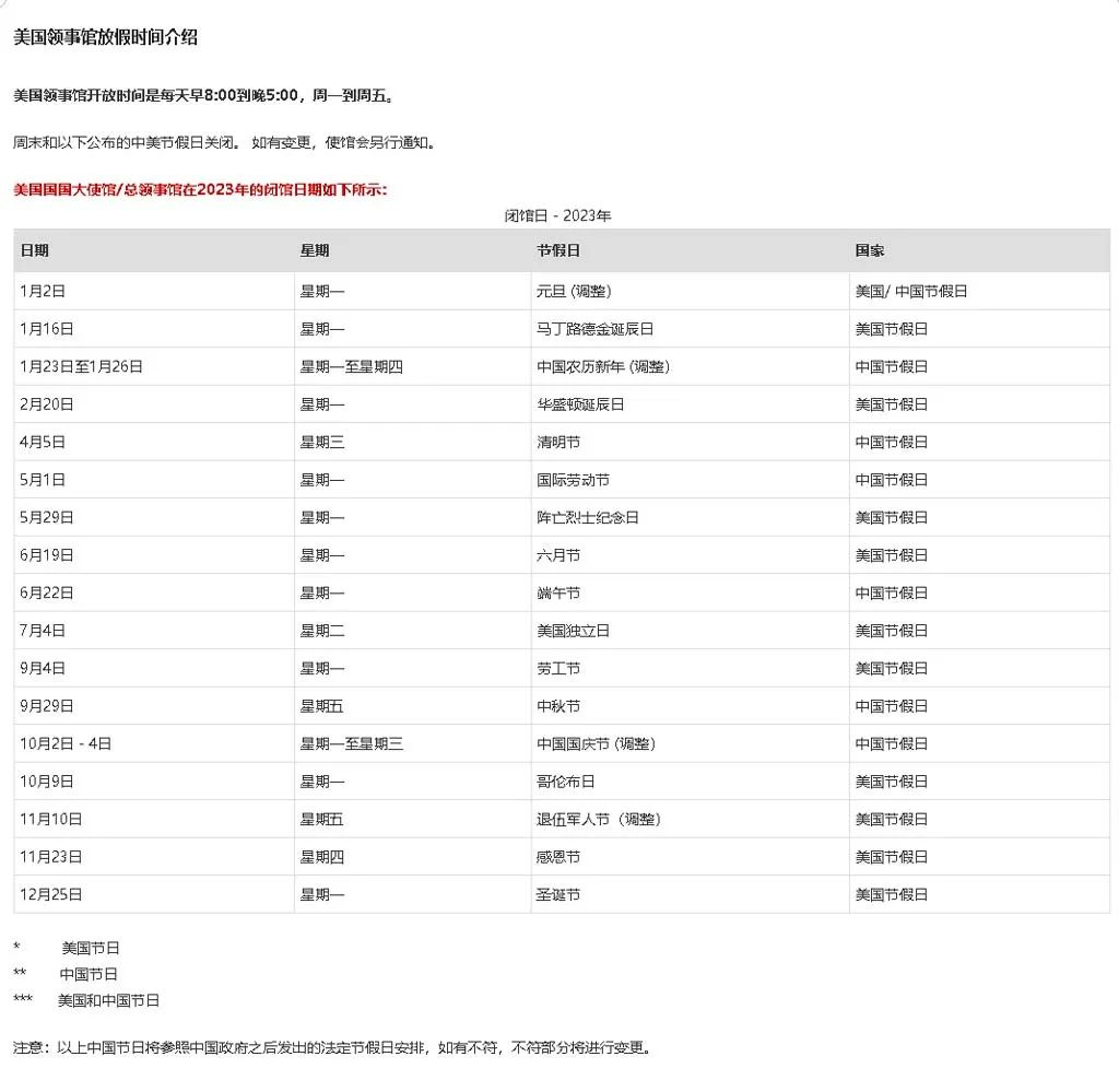 領事館開放時間是每天早8:00到晚5:00,周一到周五。 如有變更,使館會另行通知。 2023年美國使領館全年放假時間安排如下: