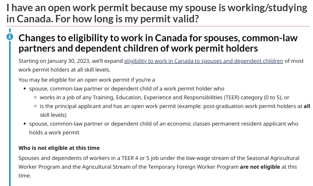 從2023年1月30日開始,加拿大移民部將把在加拿大工作的資格擴(kuò)大到大部分工作許可持有人的配偶及成年子女: