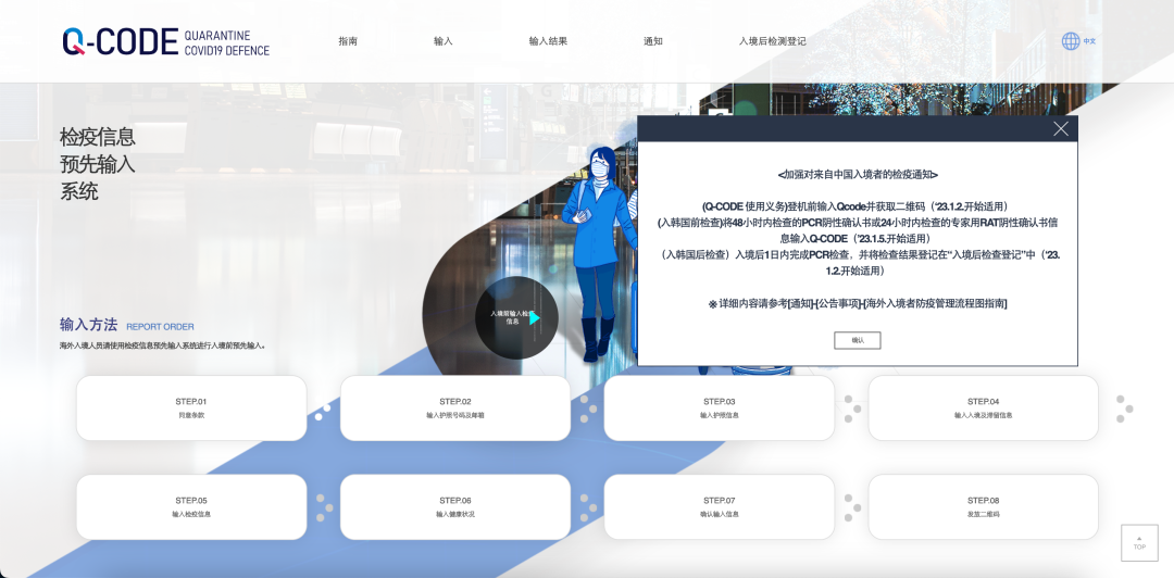 據韓國入境防疫新規,要求所有從中國入境的人員在入境前須持有登機前48小時內的核酸PCR陰性報告,或在行前24小時進行抗原檢測,陰性者方可登機,抵韓后1天內須完成一次落地檢。防疫部門還要求自中國內地入境人員乘機時,在檢疫信息輸入系統(Q-CODE)填寫在韓住所地址和聯系方式。