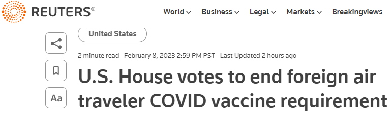 美國眾議院于2月8日投票決定終止要求大多數外國旅客接種 COVID-19 疫苗的要求,這是剩下的幾項為數不多的大流行病旅行限制之一。
