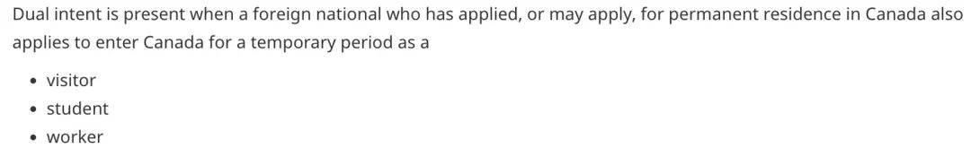 當外國公民申請了以訪客、學生或勞工的身份入境加拿大時,流露出想在加拿大申請永久居留,既存在雙重意圖(Dual intent)。