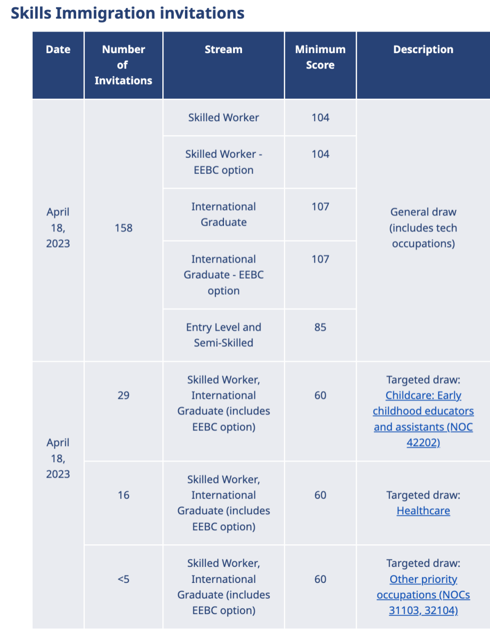 加拿大時間2023年4月18日,BC省本周抽選了158人,技術工人類別(含EE及非EE)抽分為104分。留學生類別(含EE及非EE)抽分為107分,低技術類別85分;幼教類別抽選29人,分數60;醫護類別抽選16人,分數60。