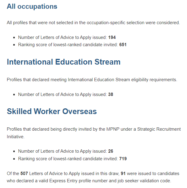 ●海外技術工人類別 (SWO):邀請26人,并且均來自曼省提名戰略招聘計劃通道(Strategic Recruitment Initiative),最低分719分。